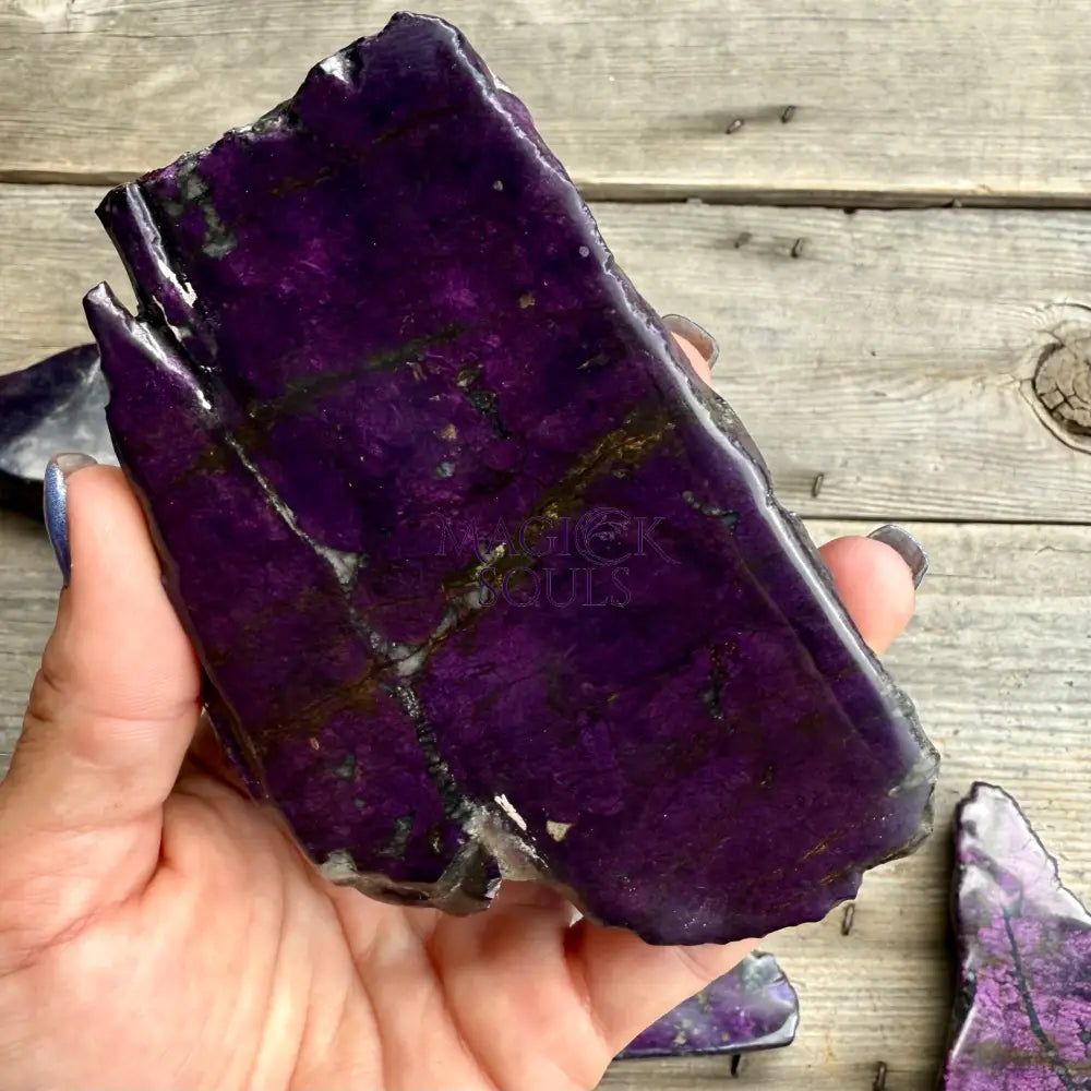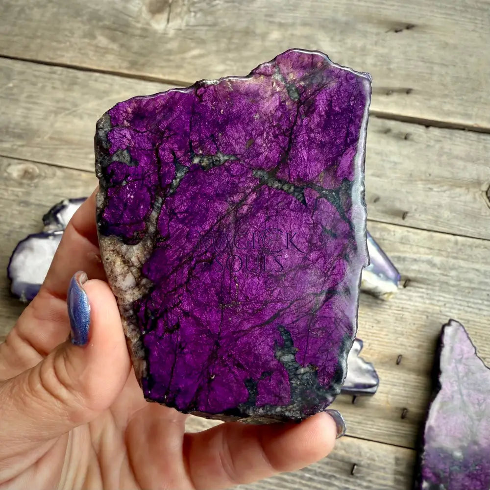 These Polished Purpurite slabs feature a deep, royal purple color accented by natural black veining and shimmering metallic tones. Polished on one side to reveal the stone’s vibrant beauty, the other side retains its natural texture, preserving the raw essence of this rare mineral.