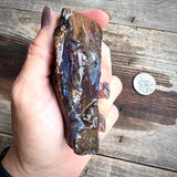Australian Boulder opals are the second most valuable type of opal (following black opal). Boulder opals are easily distinguished by their layer of solid brown ironstone left on the back of the stone. Boulder opals, as the name suggests, are mined from large ironstone boulders under the ground. Thin veins of colourful opal forms in cracks and fissures in these boulders. Because these veins of cOlof are so thin, opal cutters need to leave the ironstone on the back of the opal to form a full sized stone. The thin layer of opal in boulder opals can display any colour of the spectrum in a beautiful play of color.