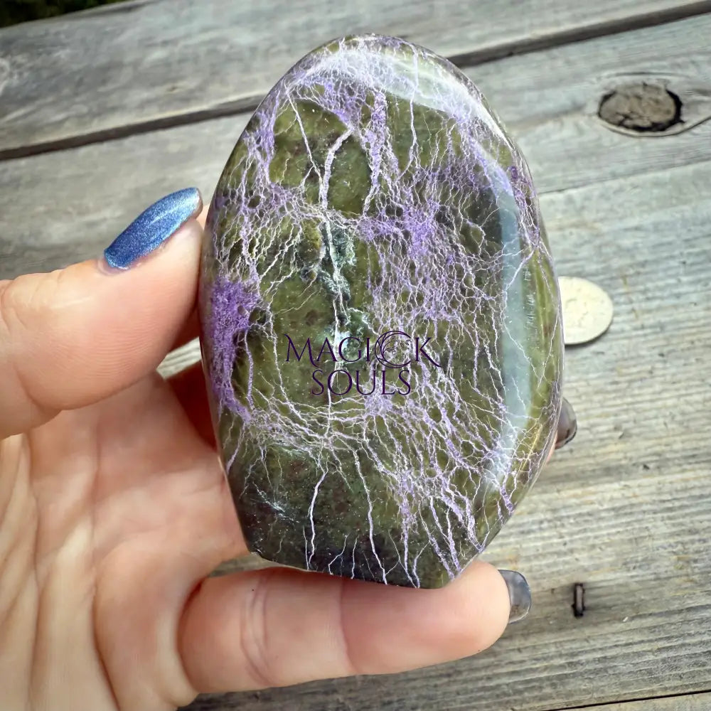 This Stichtite with Serpentine freeform from Barberton, South Africa displays a natural blend of deep green serpentine with rich purple stichtite. Polished to highlight its unique patterns, this one-of-a-kind piece carries both grounding and heart-centered energy. Stichtite is known for emotional healing, while serpentine offers protection and spiritual growth.