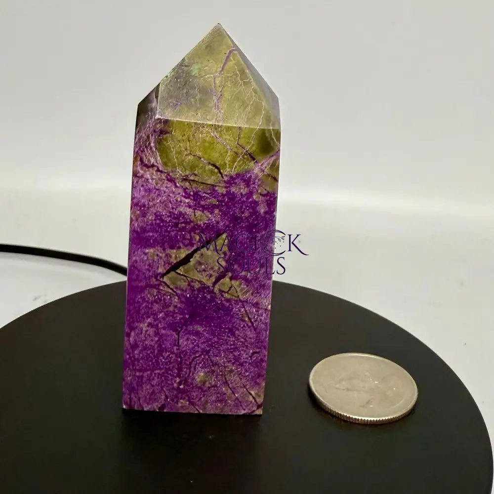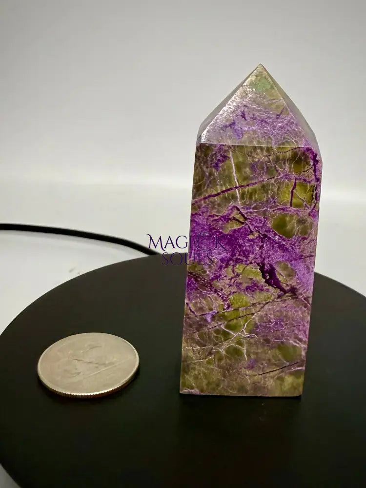 This Stichtite with Serpentine towers from Barberton, South Africa displays a natural blend of deep green serpentine with rich purple stichtite. Polished to highlight its unique patterns, this one-of-a-kind piece carries both grounding and heart-centered energy. Stichtite is known for emotional healing, while serpentine offers protection and spiritual growth.